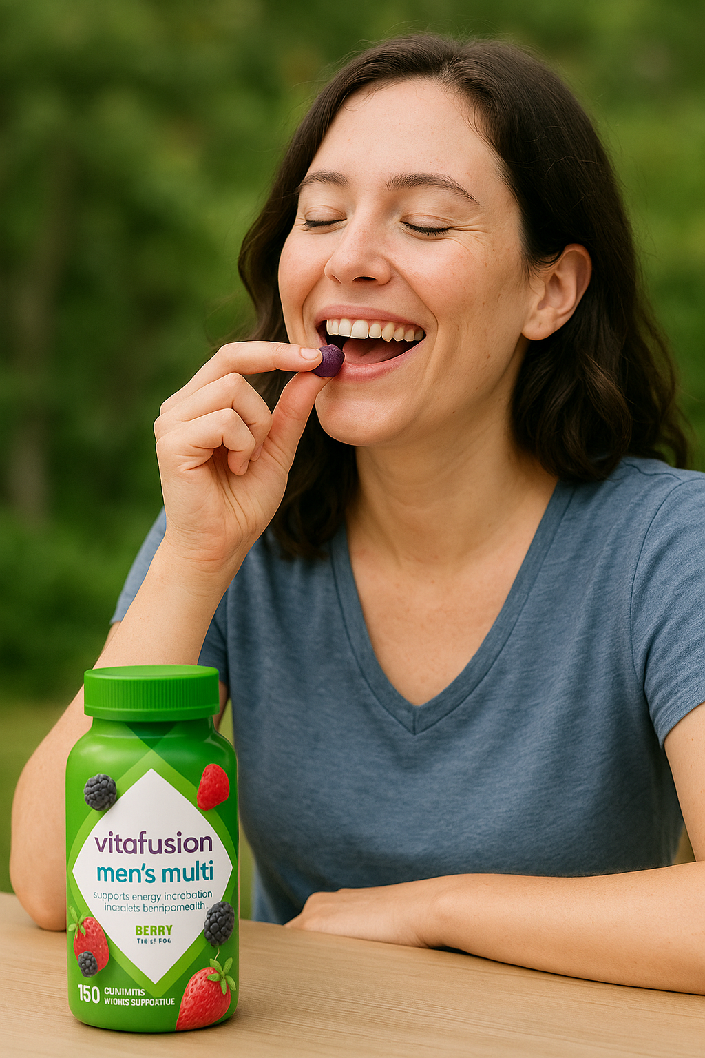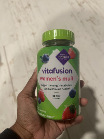 Vitafusion is an adult gummy multivitamin designed to support general wellness. Each serving size is 2 gummy vitamins, and each bottle contains 150 servings. Per serving, the product provides: 15 calories, 4 g total carbohydrates (1% DV), 3 g total sugars including 3 g added sugars (6% DV). The formula includes the following vitamins and minerals: Vitamin A (as retinyl palmitate) 790 mcg RAE (88% DV), Vitamin C (as ascorbic acid and sodium ascorbate) 33 mg (37% DV), Vitamin D-3 (as cholecalciferol) 25 mcg / 1000 IU (125% DV), Vitamin E (as dl-alpha-tocopheryl acetate) 16.5 mg (110% DV), Vitamin B-6 (as pyridoxine HCl) 4.3 mg (253% DV), Folate 400 mcg DFE / 240 mcg folic acid (100% DV), Vitamin B-12 (as cyanocobalamin) 7.2 mcg (300% DV), Biotin 30 mcg (100% DV), Pantothenic Acid (as calcium d-pantothenate) 2.5 mg (50% DV), Iodine (as potassium iodide) 38 mcg (25% DV), Zinc (as zinc citrate) 3.8 mg (35% DV), Chromium (as chromium picolinate) 123 mcg (351% DV), Molybdenum (as molybdenum citrate) 12 mcg (27% DV), Sodium 10 mg (<1% DV), and Boron (as boron citrate) 150 mcg (Daily Value not established). Other ingredients include glucose syrup, sugar, water, gelatin, less than 2% of citric acid, natural colors from blueberry and carrot concentrates and purple carrot juice concentrate, natural flavors, fumaric acid, lactic acid, pectin, and sodium citrate. The product is processed in a facility that also handles egg, fish, shellfish, soy, and tree nuts. Suggested use: adults take two gummy vitamins per day and chew thoroughly before swallowing.